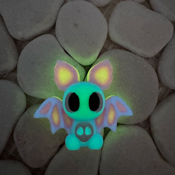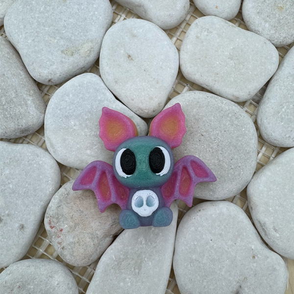 Diese kleine Fledermaus ist einfach zum Verlieben – gruselig süß, mit einem Totenkopf auf dem Bauch und einem farbenfrohen Farbverlauf von Türkis bis Pink. Ihre großen schwarzen Augen und die detailreichen Flügel verleihen ihr einen einzigartigen Charakter.