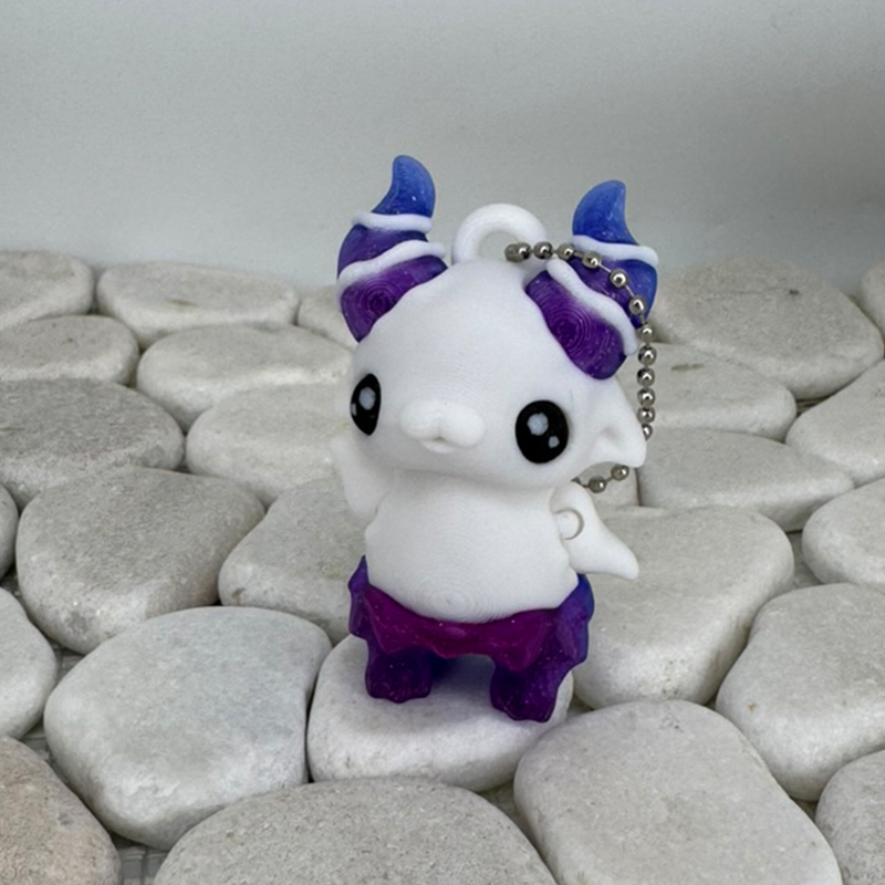 Dieser Pixie Beasty vereint niedlichen Charme mit einem Hauch von Mystik. Mit seinen großen, glänzenden Augen und den markanten Hörnern in tiefem Violett und leuchtendem Orange wirkt er zugleich freundlich und geheimnisvoll.